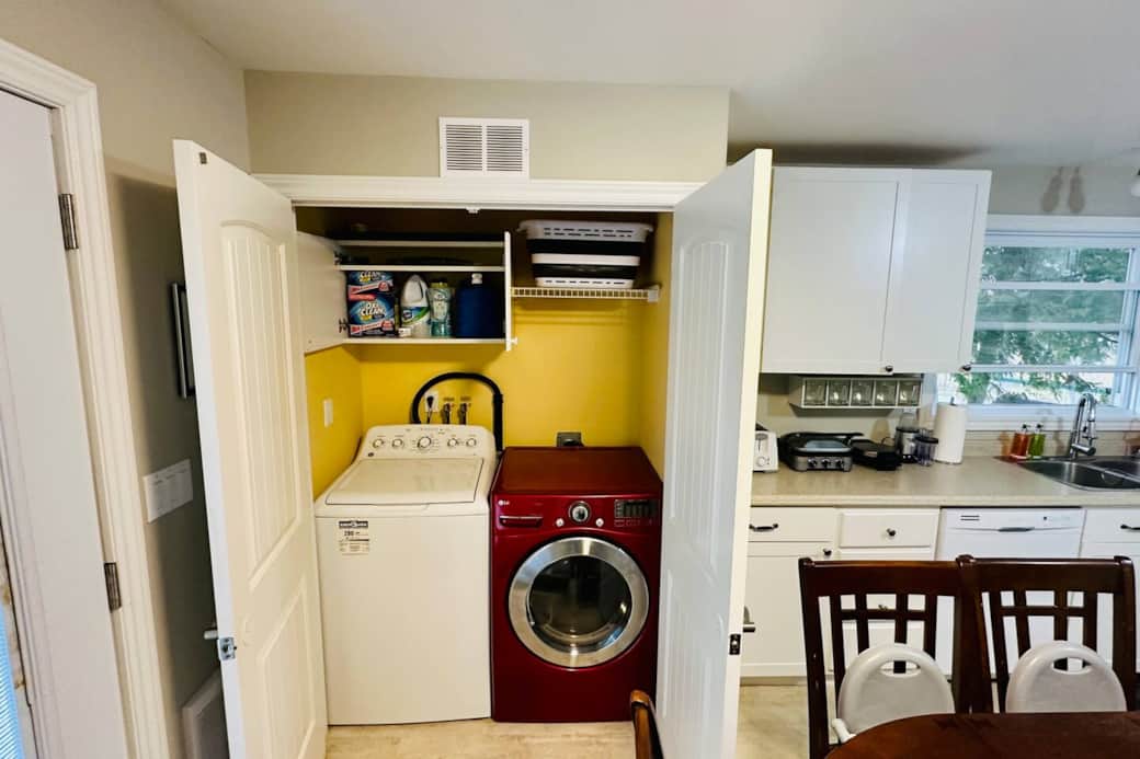Modern kitchen setup with toaster, griddle, blender, dishwasher, and everything you need for cooking.